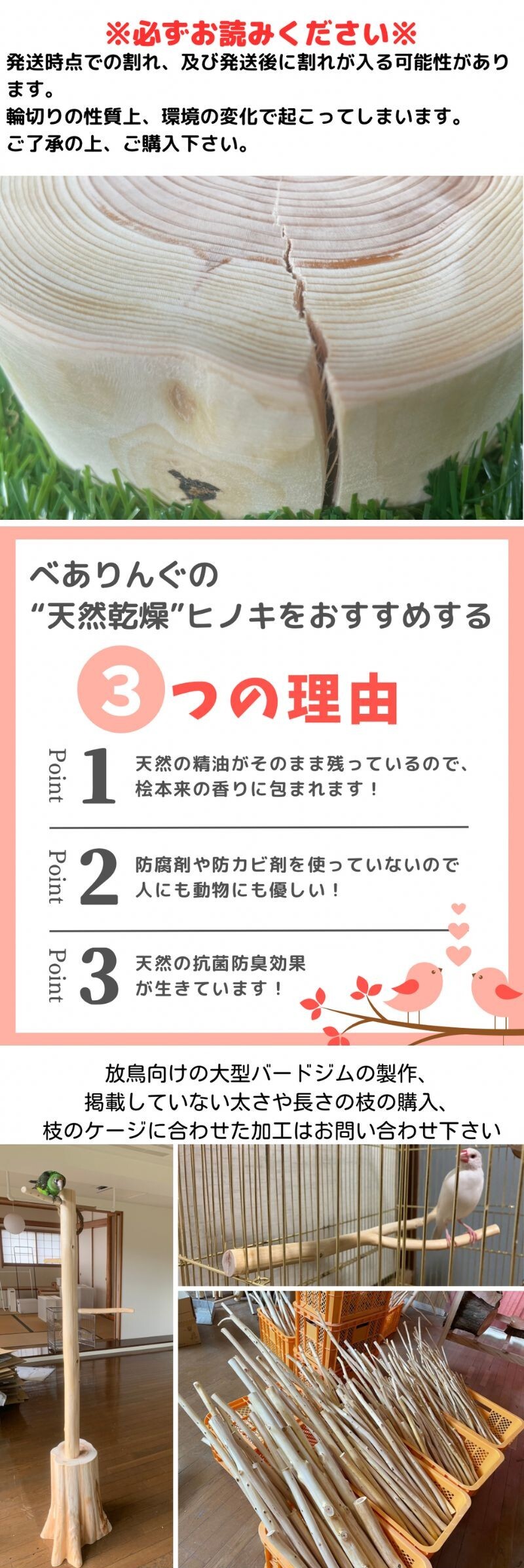 日々、山に入っているべありんぐだからこそ作ることができる、世界に1つだけの止まり木です。土台は平行カットしており、鳥が止まってもガタつきません。